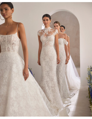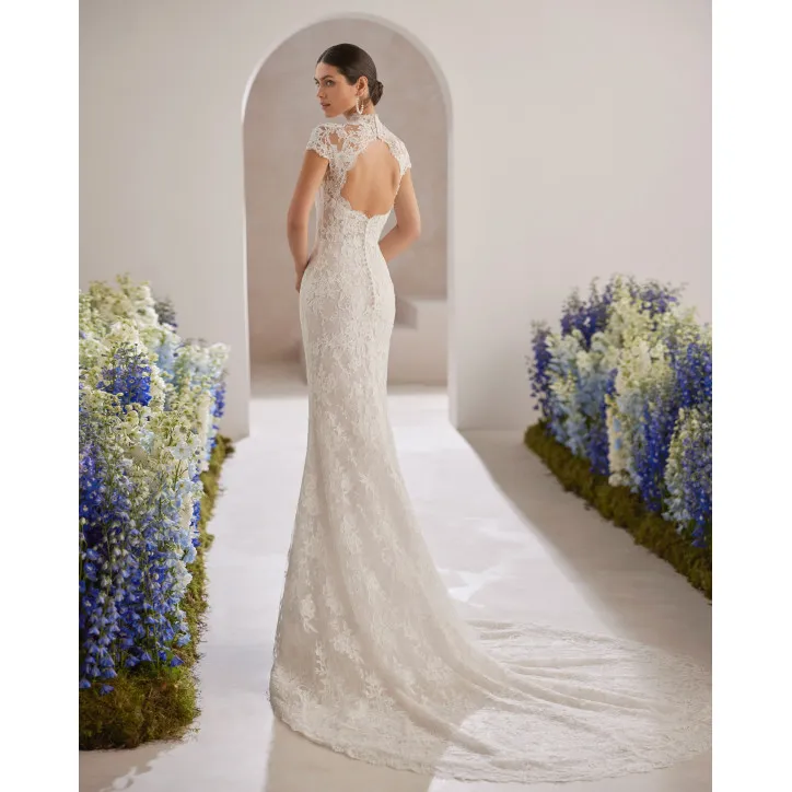 La collezione di Rosa Clará si caratterizza per la sua eleganza e raffinatezza grazie ad abiti in crêpe con volant scultorei. Per aggiungere un tocco di romanticismo, il marchio combina fiori nello stesso tessuto di crêpe dell'abito con altri in organza, per creare composizioni delicate che decorano scollature e spalle.