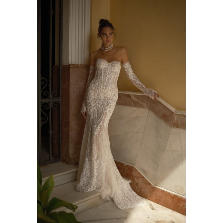 La collezione di abiti da sposa Berta esalta la silhouette della sposa, tra eleganza e sensualità, scollature audaci e schiene scoperte.