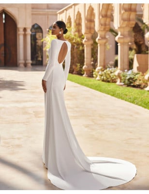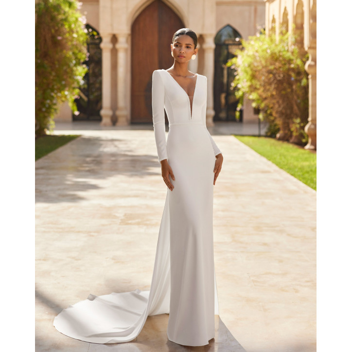 La collezione di Rosa Clará si caratterizza per la sua eleganza e raffinatezza grazie ad abiti in crêpe con volant scultorei. Per aggiungere un tocco di romanticismo, il marchio combina fiori nello stesso tessuto di crêpe dell'abito con altri in organza, per creare composizioni delicate che decorano scollature e spalle.