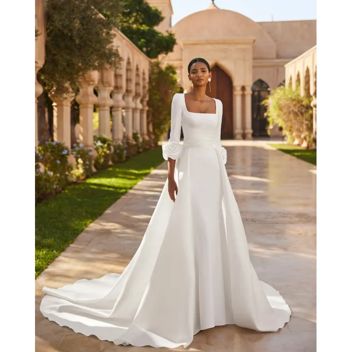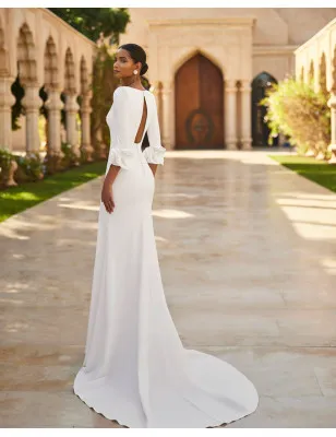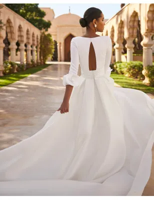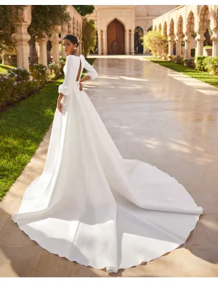 La collezione di Rosa Clará si caratterizza per la sua eleganza e raffinatezza grazie ad abiti in crêpe con volant scultorei. Per aggiungere un tocco di romanticismo, il marchio combina fiori nello stesso tessuto di crêpe dell'abito con altri in organza, per creare composizioni delicate che decorano scollature e spalle.