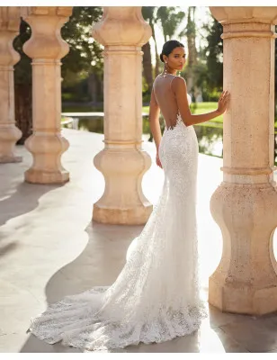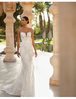 La collezione di Rosa Clará si caratterizza per la sua eleganza e raffinatezza grazie ad abiti in crêpe con volant scultorei. Per aggiungere un tocco di romanticismo, il marchio combina fiori nello stesso tessuto di crêpe dell'abito con altri in organza, per creare composizioni delicate che decorano scollature e spalle.