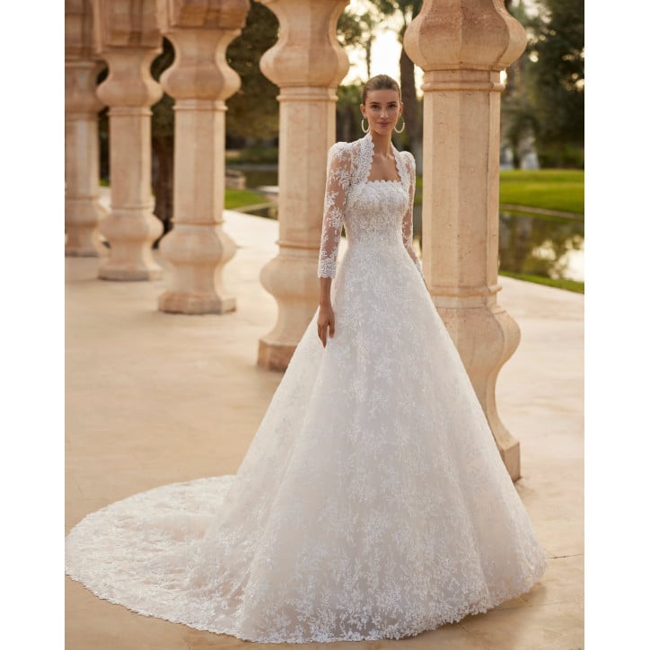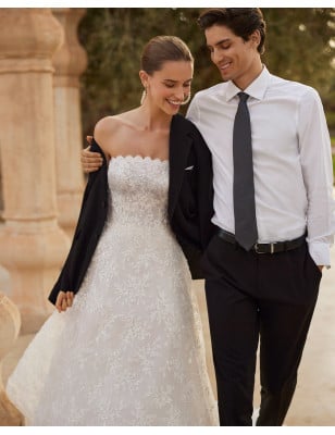 La collezione di Rosa Clará si caratterizza per la sua eleganza e raffinatezza grazie ad abiti in crêpe con volant scultorei. Per aggiungere un tocco di romanticismo, il marchio combina fiori nello stesso tessuto di crêpe dell'abito con altri in organza, per creare composizioni delicate che decorano scollature e spalle.