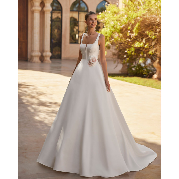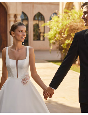 La collezione di Rosa Clará si caratterizza per la sua eleganza e raffinatezza grazie ad abiti in crêpe con volant scultorei. Per aggiungere un tocco di romanticismo, il marchio combina fiori nello stesso tessuto di crêpe dell'abito con altri in organza, per creare composizioni delicate che decorano scollature e spalle.