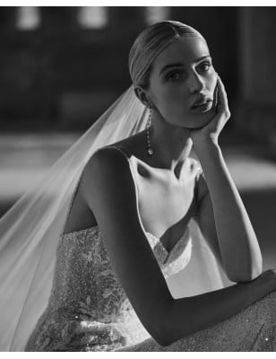La collezione di Rosa Clará si caratterizza per la sua eleganza e raffinatezza grazie ad abiti in crêpe con volant scultorei. Per aggiungere un tocco di romanticismo, il marchio combina fiori nello stesso tessuto di crêpe dell'abito con altri in organza, per creare composizioni delicate che decorano scollature e spalle.