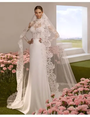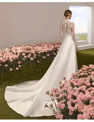 La collezione di Rosa Clará si caratterizza per la sua eleganza e raffinatezza grazie ad abiti in crêpe con volant scultorei. Per aggiungere un tocco di romanticismo, il marchio combina fiori nello stesso tessuto di crêpe dell'abito con altri in organza, per creare composizioni delicate che decorano scollature e spalle.
