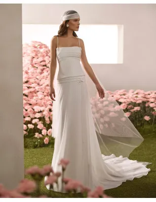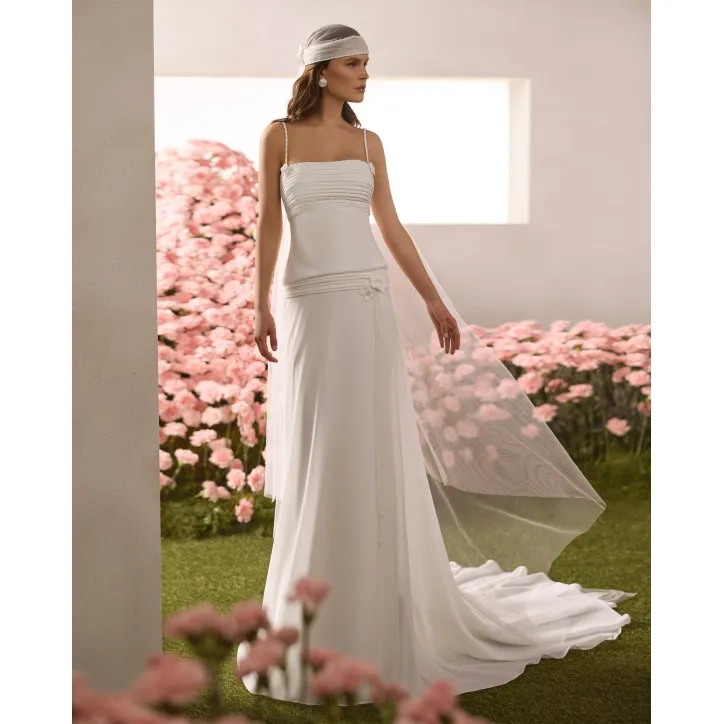 La collezione di Rosa Clará si caratterizza per la sua eleganza e raffinatezza grazie ad abiti in crêpe con volant scultorei. Per aggiungere un tocco di romanticismo, il marchio combina fiori nello stesso tessuto di crêpe dell'abito con altri in organza, per creare composizioni delicate che decorano scollature e spalle.