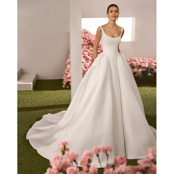 La collezione di Rosa Clará si caratterizza per la sua eleganza e raffinatezza grazie ad abiti in crêpe con volant scultorei. Per aggiungere un tocco di romanticismo, il marchio combina fiori nello stesso tessuto di crêpe dell'abito con altri in organza, per creare composizioni delicate che decorano scollature e spalle.