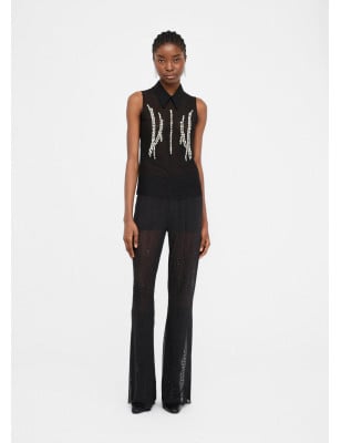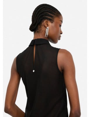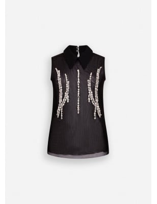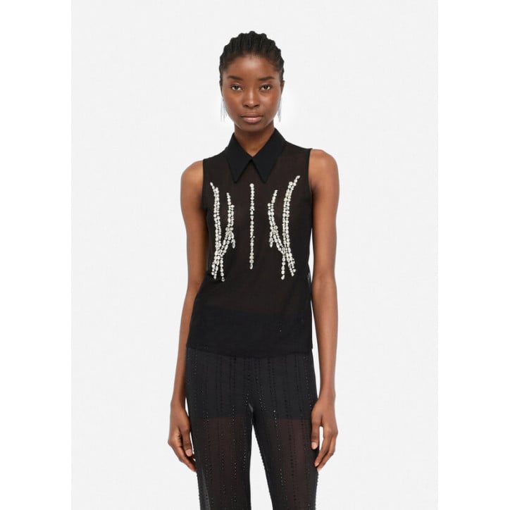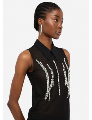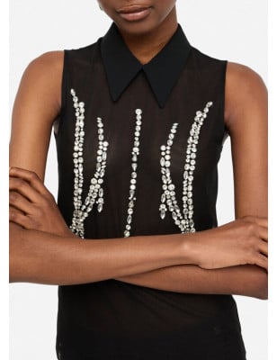 Top in tulle stretch. Strass applicati. Collo a camicia con bottoni sul retro. Goccia sul retro. Logo in metallo sul retro. Composizione: Tessuto principale: 95% Poliestere, 5% Elastan| Tessuto secondario: 100% Poliestere LAVAGGIO: Lavare a mano | Non trattare con cloro | Non Lavare a secco | Lavare a rovescio | Non strofinare durante il lavaggio ASCIUGATURA: Non usare Asciugatrice STIRAGGIO: Non stirare | Stirare a temperatura massima 110 °C | Non stirare le decorazioni | Stirare interponendo un panno.