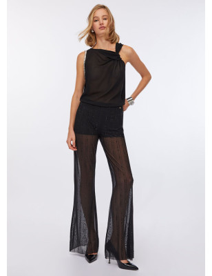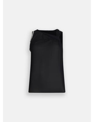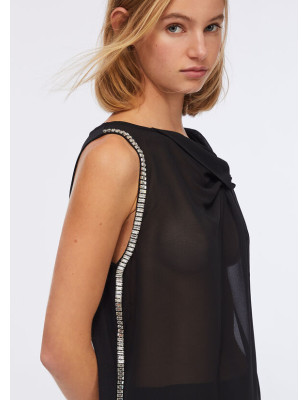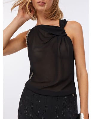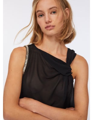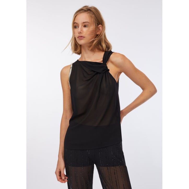 Top in jersey di cotone stretch e georgette. Strass applicati. Scollo con motivo nodo. Sorretto da spalline. Logo in metallo sul retro. Composizione: Tessuto principale: 95% Cotone, 5% Elastan| Tessuto secondario: 100% Poliestere LAVAGGIO: Lavare a mano | Non trattare con cloro | Non Lavare a secco | Lavare a rovescio | Non strofinare durante il lavaggio ASCIUGATURA: Non usare Asciugatrice STIRAGGIO: Non stirare | Stirare a temperatura massima 110 °C | Non stirare le decorazioni | Stirare interponendo un panno.