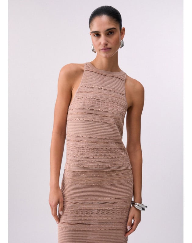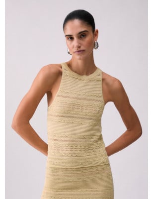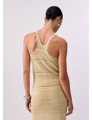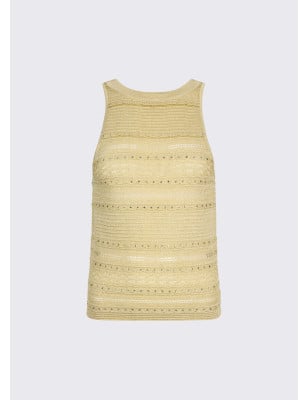 Top in maglia traforata. Lavorazione punzonata. Interventi in lurex .Composizione: Tessuto principale: 73% Viscosa, 18% Poliammide, 9% Poliestere metallizzato LAVAGGIO: Lavare a mano | Non trattare con cloro | Non Lavare a secco | Lavare a rovescio | Non strofinare durante il lavaggio | Non lasciare a mollo i capi nell'acqua | ASCIUGATURA: Non usare Asciugatrice | Asciugare in piano | STIRAGGIO: Non stirare | Stirare a temperatura massima 110 °C | Non stirare le decorazioni | Stirare interponendo un panno.