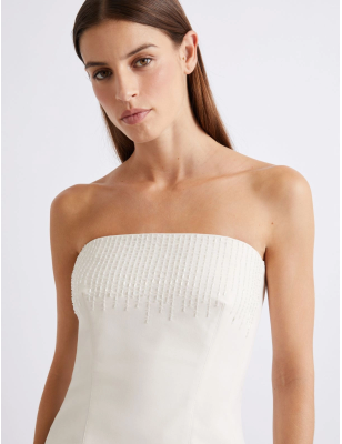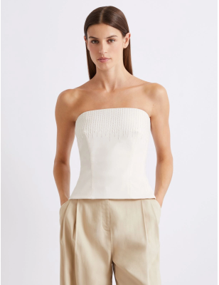 Nuovo trend di stagione, il top bustier è la sintesi perfetta di modernità e fascino. In tela stretch con scollo dritto e delicati arricci sui fianchi. Tessuto principale contenente una percentuale di poliestere riciclato superiore al 50% Top in tela bistretch con fodera interna Fit aderente Scollo dritto Arricci lungo i fianchi e apertura posteriore con zip Ricamo con canottiglie e perline sulla parte alta davanti. Composizione Tessuto 62% poliestere, 34% viscosa, 4% elastan; fodera 64% acetato, 36% poliestere. Lavaggio Lavare a mano acqua fredda max 40°; non candeggiare; non asciugare in tamburo; asciugare appeso in ombra; ferro tiepido max 120 gradi c; lavare a secco delicato con percloroetilene; non lavare ad umido professionale.; lavare il capo allacciato.; non stirare le applicazioni.; rovesciare il capo prima del lavaggio.